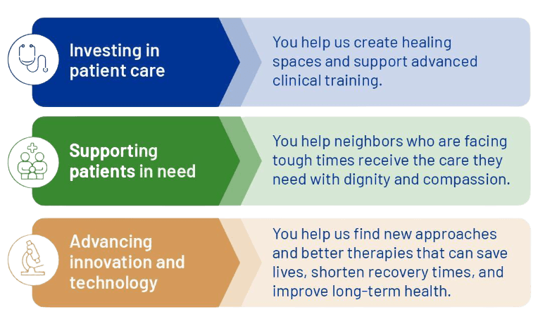 As not-for-profit medical centers, your generosity funds our greatest needs, providing the latest tools, training, and treatments.